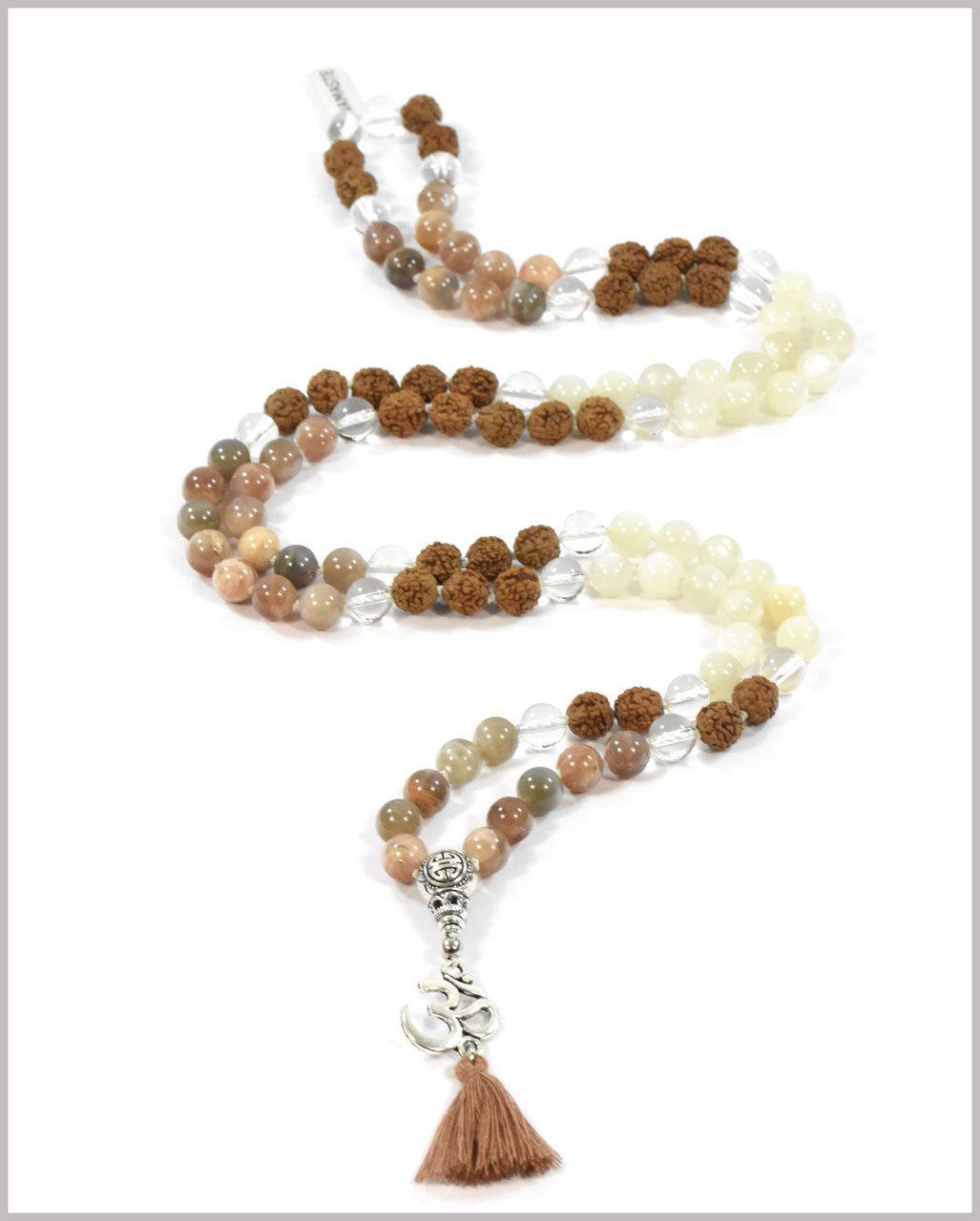 Diese Malakette habe ich kombiniert aus Mondstein/Bergkristall Edelsteinen und Rudraksha Perlen, Guru Perle, OM, einer Quaste