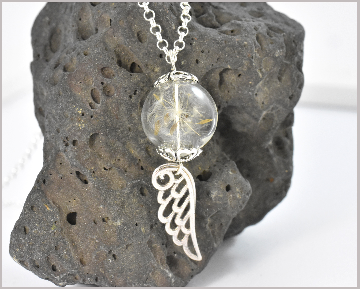 Sehr hübsche und ausgefallene Kette. Die Glasperle ist gefüllt mit echten Pusteblumensamen. Die Kugel besteht aus einem etwas dickerem Glas. Selbst wenn man mal